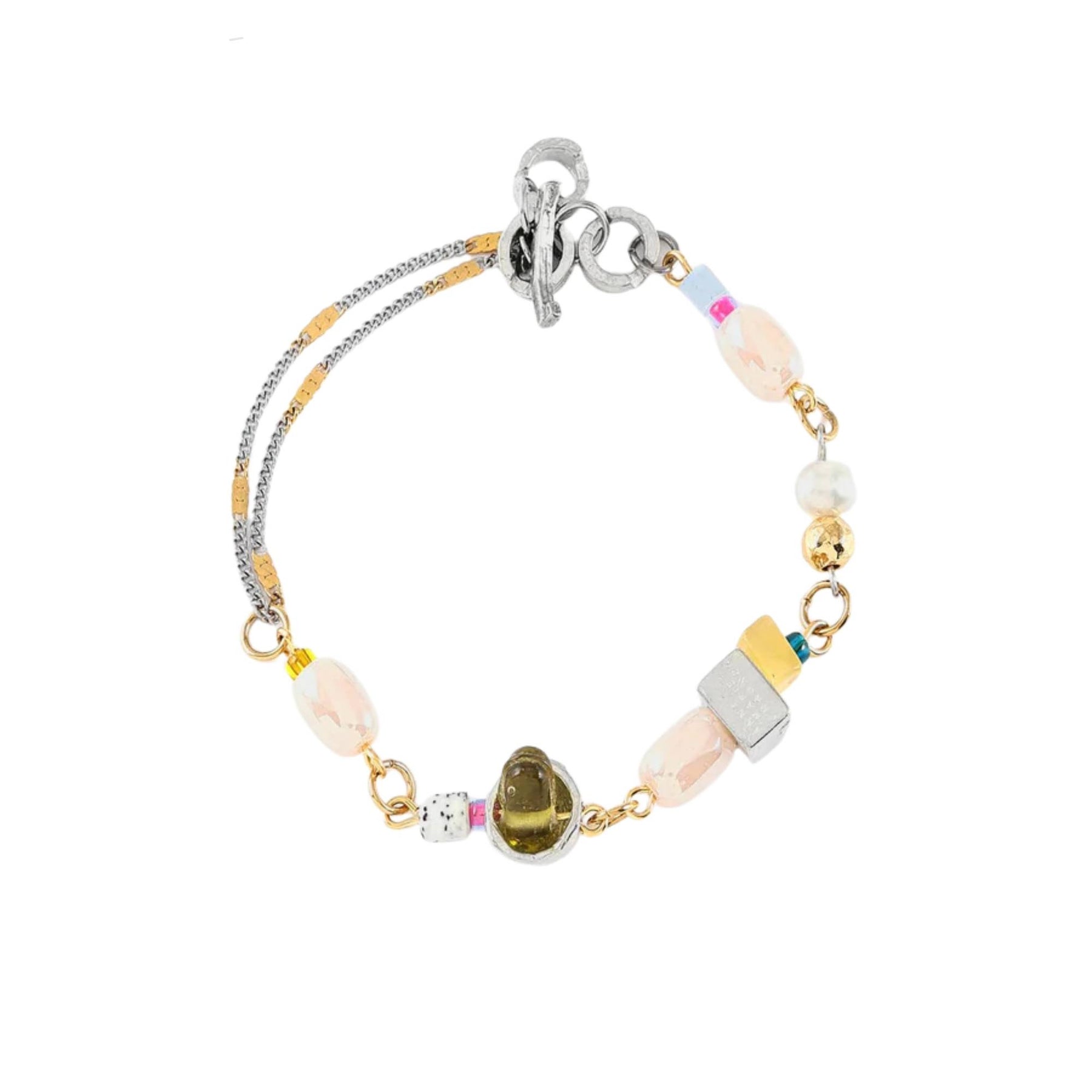 Le bracelet Cymelle tutti frutti propose une composition libre et colorée où les matières se rencontrent avec spontanéité. Une chaîne en acier inoxydable trace une ligne fine au poignet, tandis qu’un assemblage d’agate, de quartz, de perles d’eau douce, de verre coloré et de pièces en étain brut et plaqué or 22 carats crée un jeu de textures et de formes unique. Chaque élément semble s’ajouter comme une petite trouvaille, donnant au bracelet un caractère vivant et expressif.