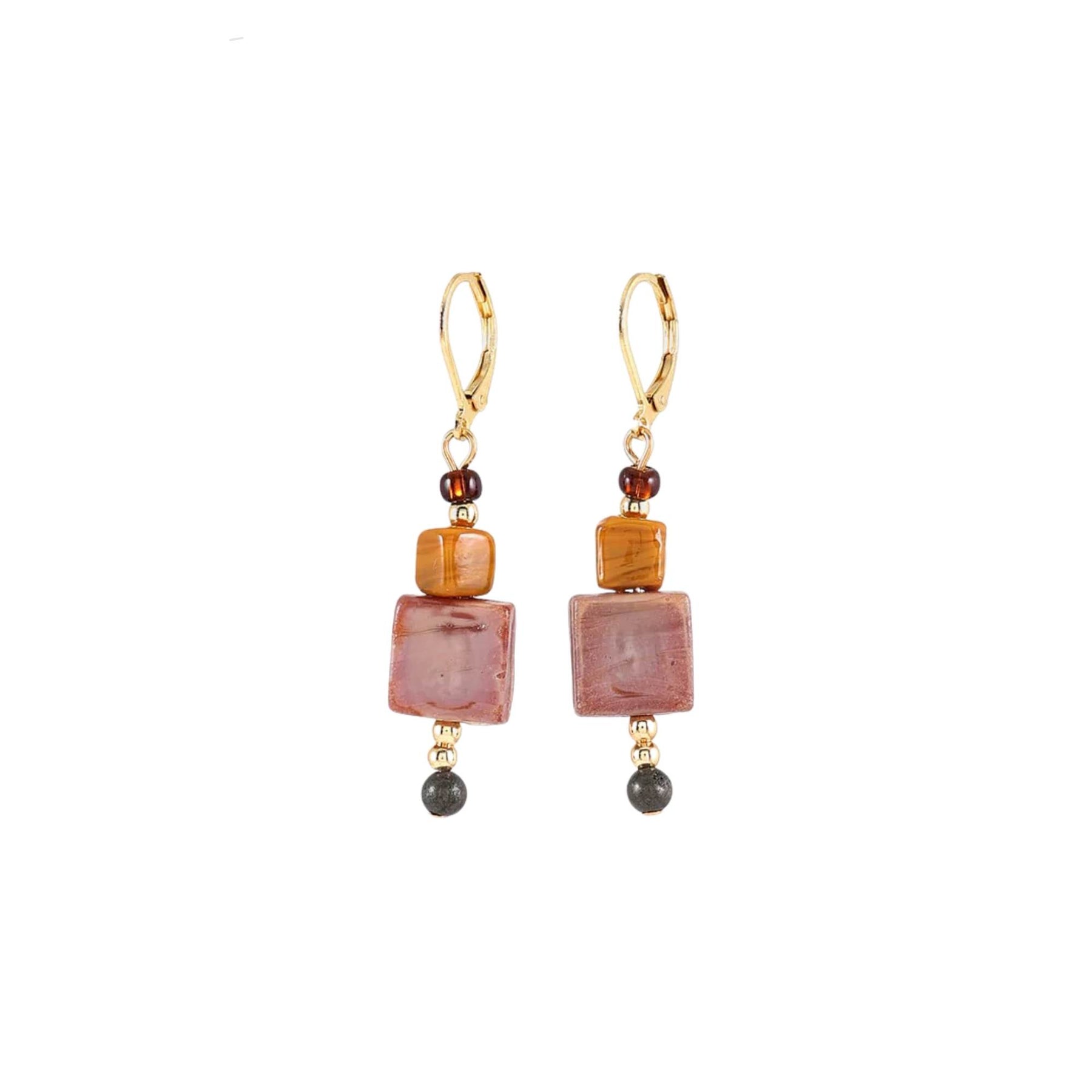 Boucles d'oreilles suspendues dorées avec billes de verre roses et oranges par Anne-Marie Chagnon