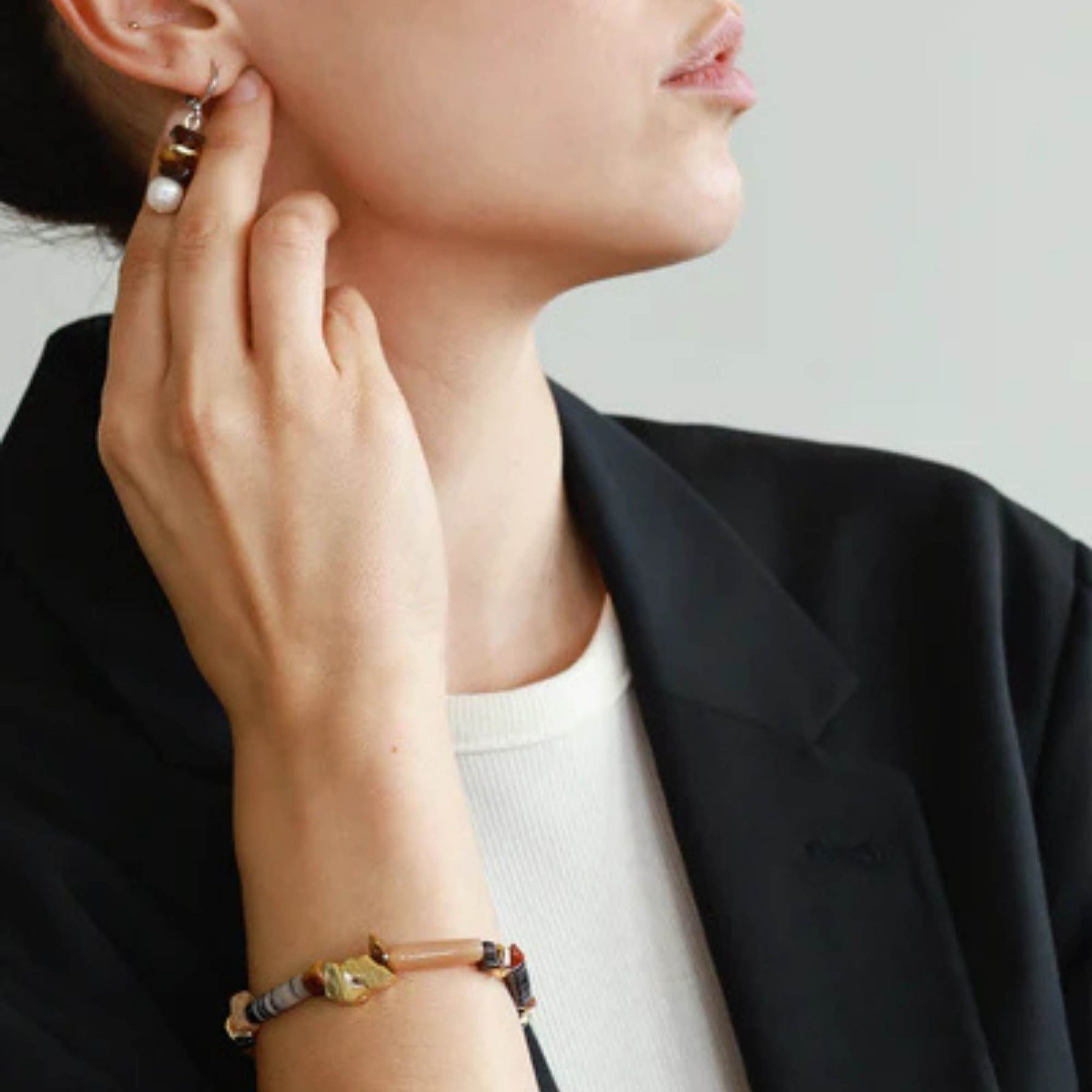 Les boucles d’oreilles allongées Orcus Moka-Mousse d’Anne-Marie Chagnon jouent sur la verticalité et la superposition de textures et de teintes. Agate, jaspe, étain naturel, plaqué or 22 carats et perles d’eau douce s’enchaînent avec fluidité pour créer un rythme minéral et organique, reflétant la tendance naturelle et contemporaine de la saison.